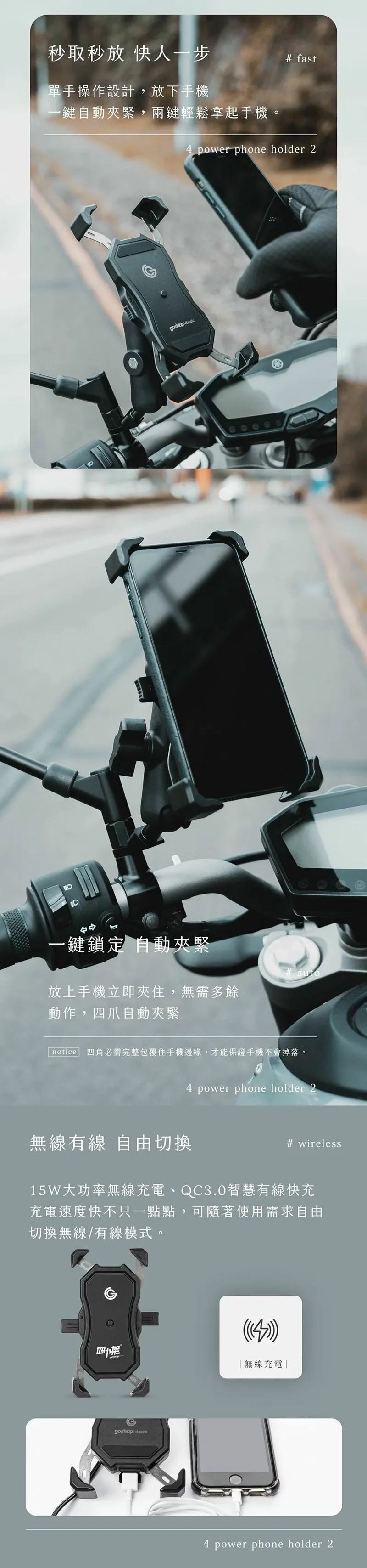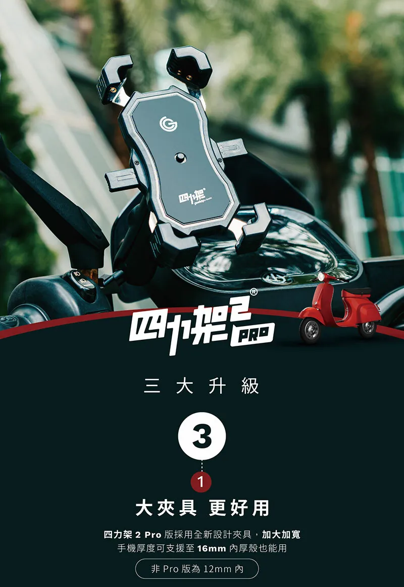 2分鐘前GC 四力架2 / 2s 單手操作 快人一步 最新四力架2 Pro 自動夾緊 USB充電 無線充電兩用機車手機架 外送必備 接單神器 - 四力架2s Pro(快充版)一入組NT$1,180