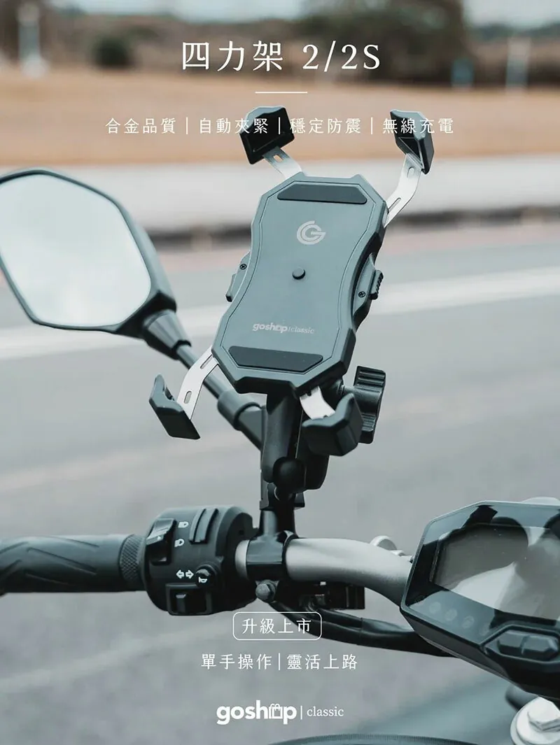 15分鐘前GC 四力架2 / 2s 單手操作 快人一步 最新四力架2 Pro 自動夾緊 USB充電 無線充電兩用機車手機架 外送必備 接單神器 - 四力架2s(通用快充版)一入組NT$1,080